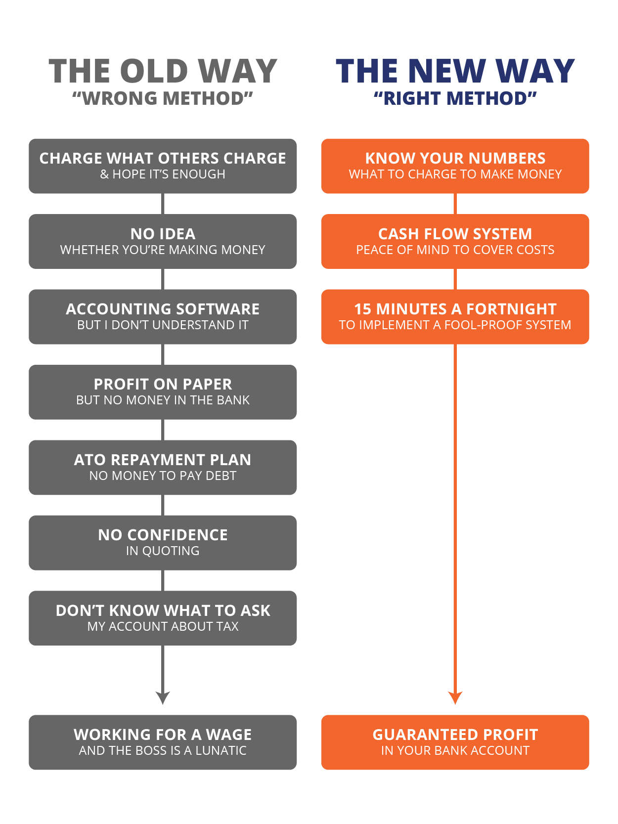 Profit in Your Pocket is different because it actually generates results in a way that makes sense. You analyse your current numbers to understand your current cost structure, you adjust as necessary to hit your target margin and implement the cash flow system to take the guess work out of what money is available to spend and what has to be put away.