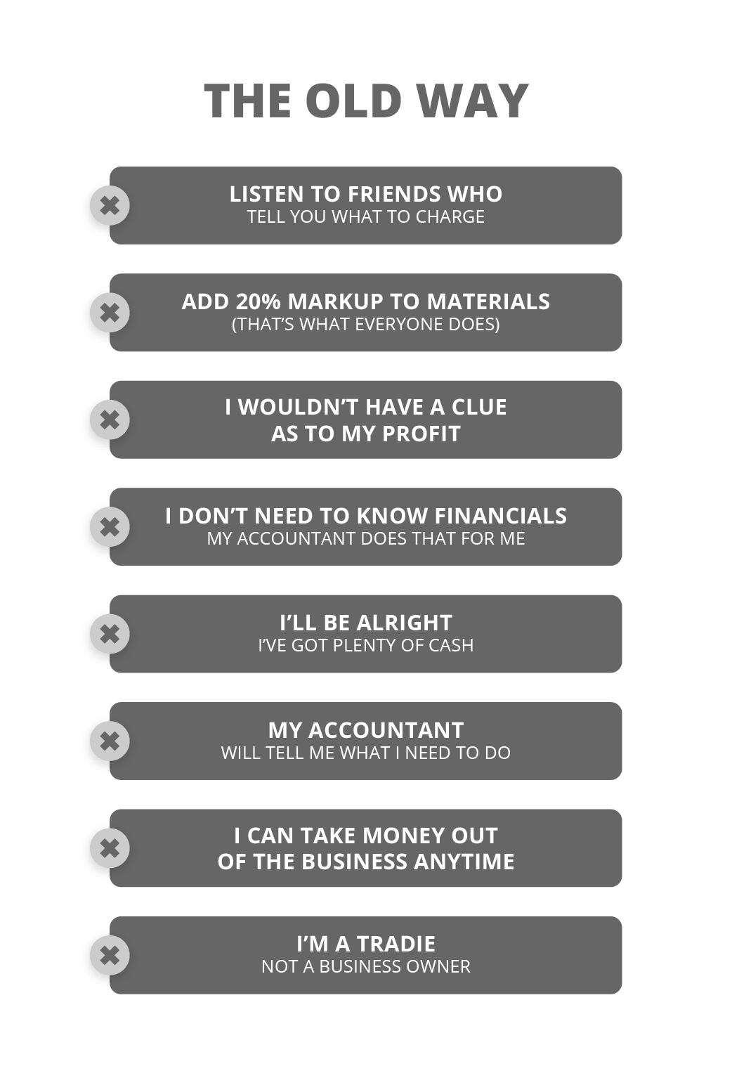 You’re getting a 95-page book that outlines the exact strategy that we’ve used to help tradie business owners in every industry sector to understand their financials, what they need to charge and how to manage their cash flow. We do this through following the Tradie Five in Five process needed to implement the Profit in Your Pocket System.